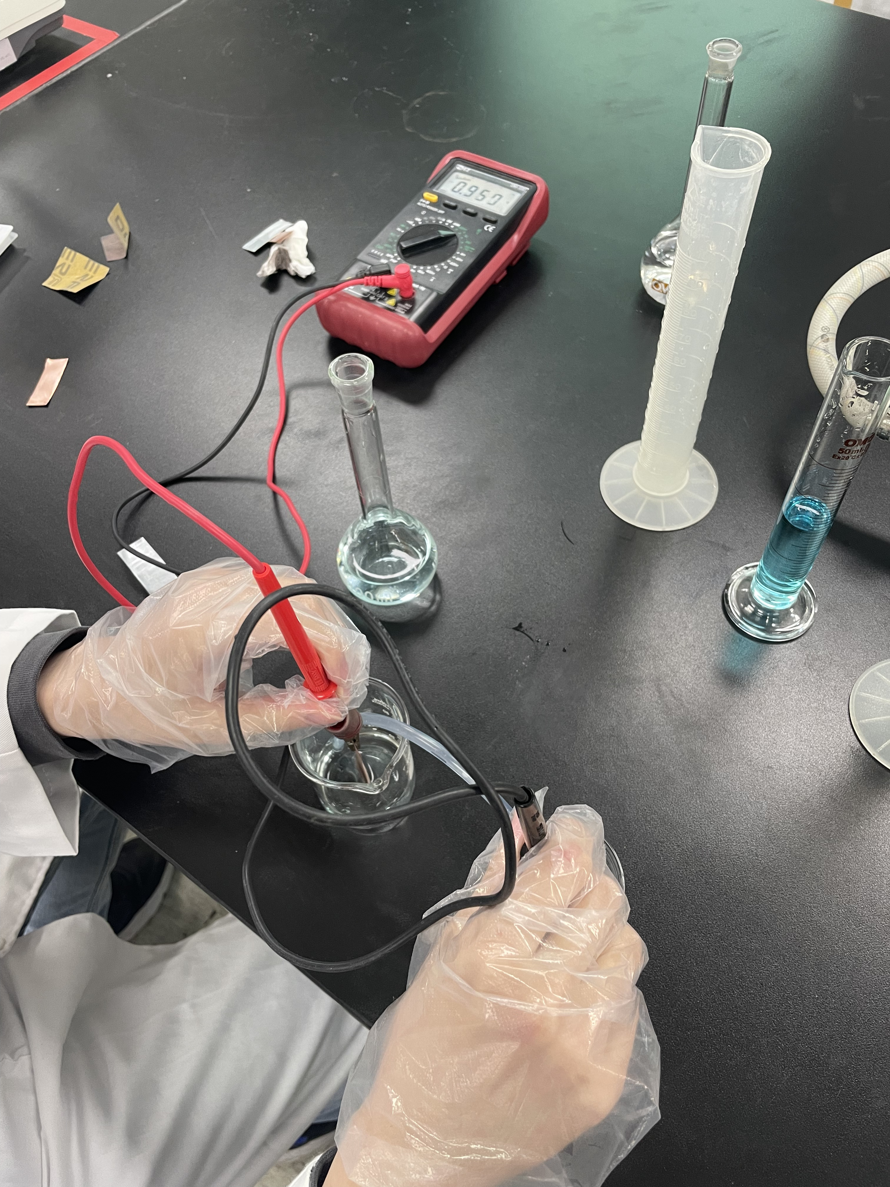 1) 구리와 아연판을 측정 전에 사포로 문질러 광택이 나도록 , 증류수로 표면을 세척한다.