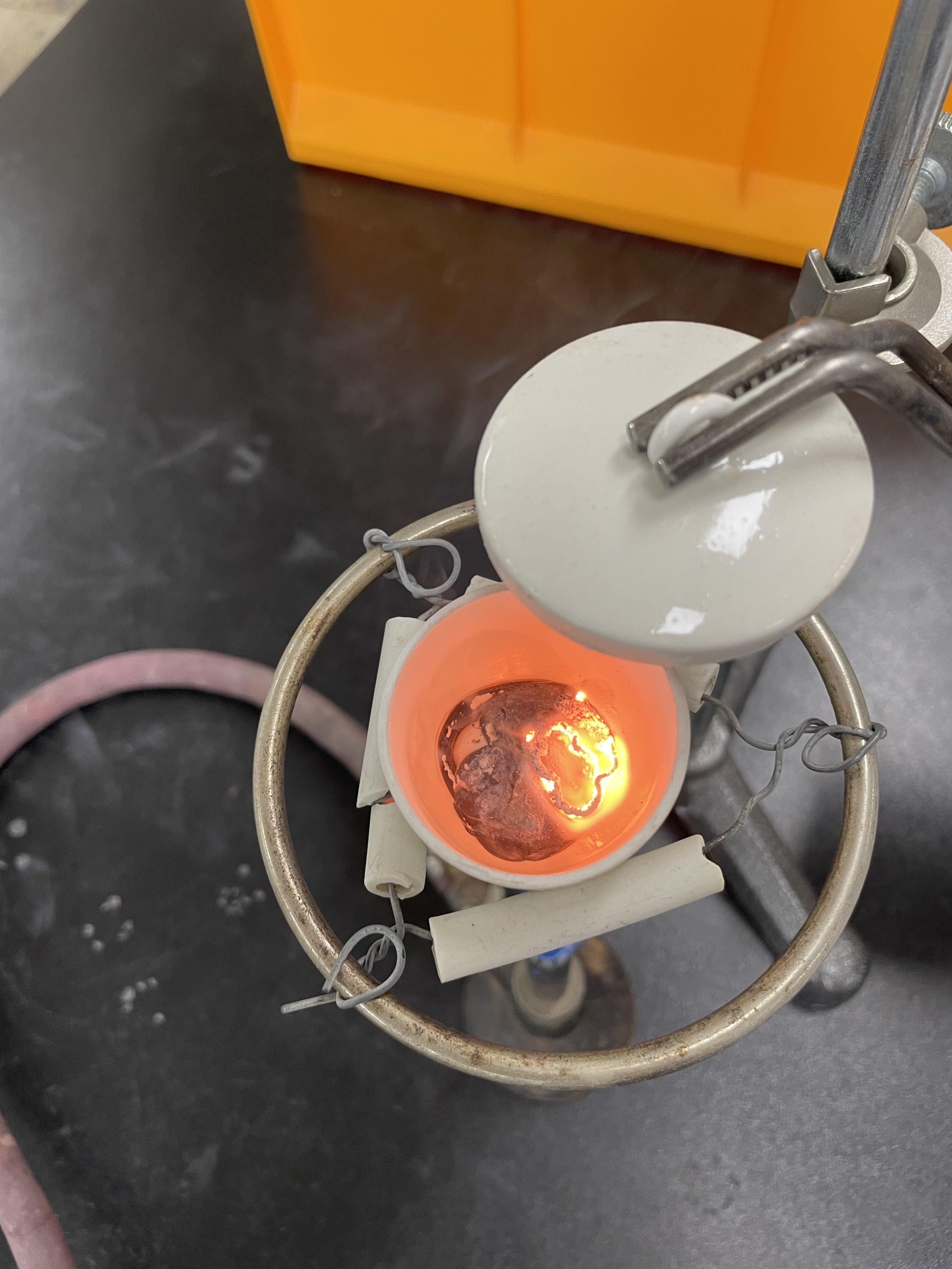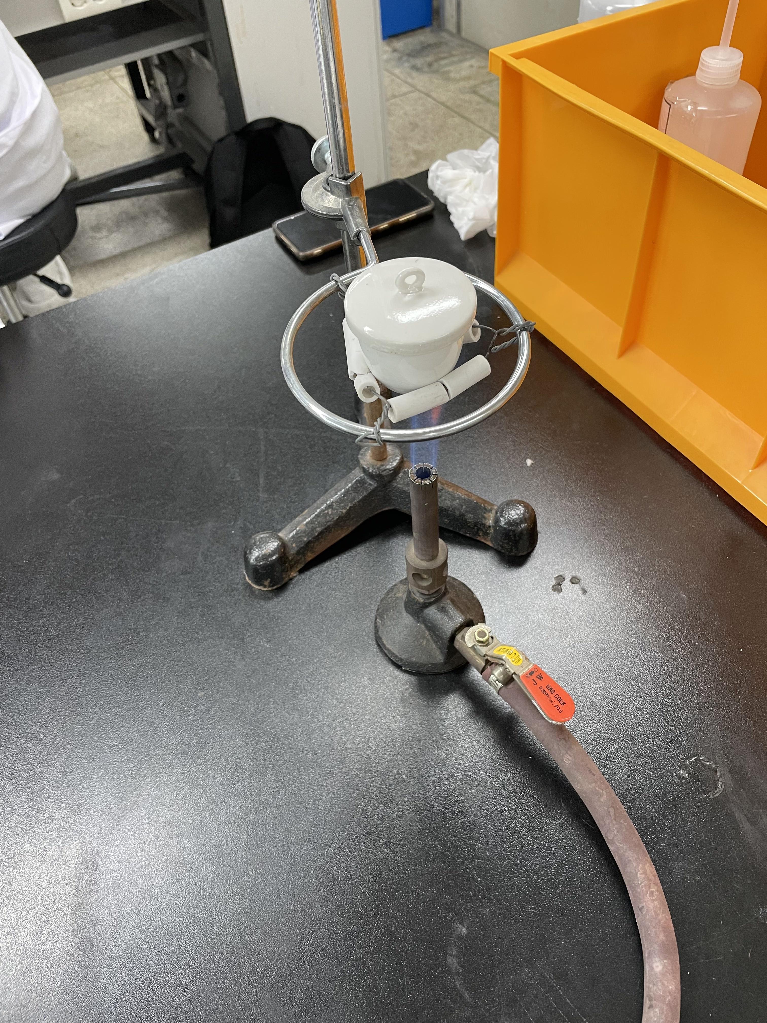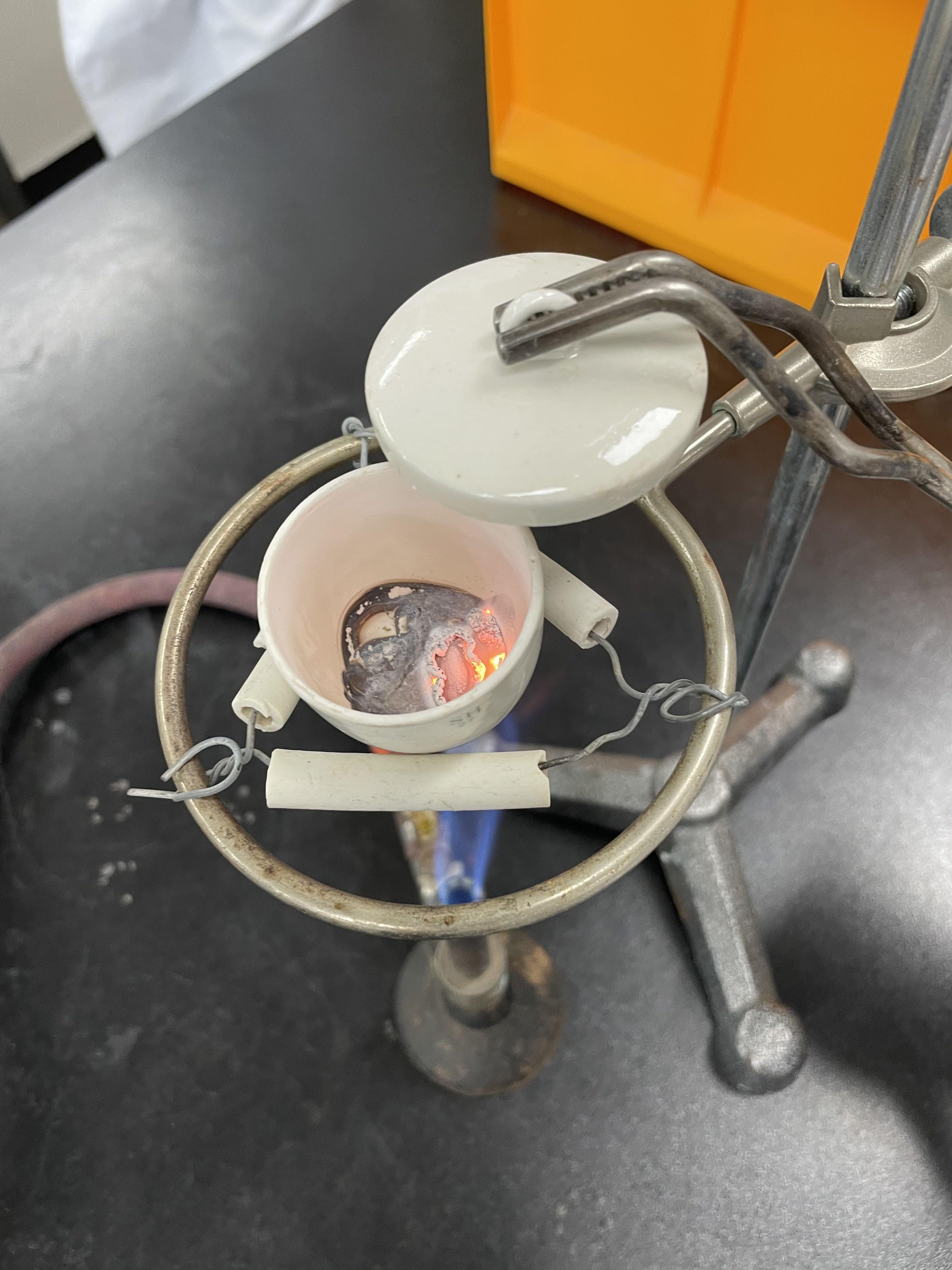 4) 도가니에 뚜껑을 덮은 후, 링클램프 위에 고정된 삼각링에 도가니를 고정시키고 가열한다. 가열 시작부터 연소 시간을 잰다.