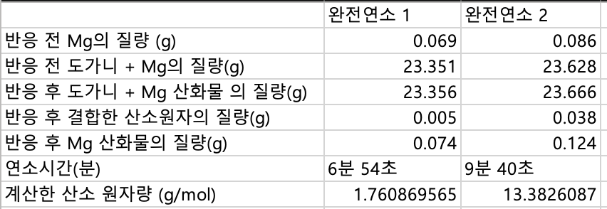 뭔가 이상한게 완전연소 2가 산소 원자량에 근접하게 나왔는데