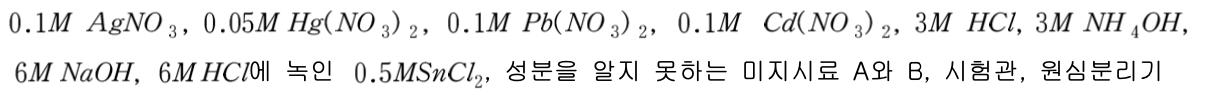 1 Ag+, Cd2+, Pb2+, Hg2+ 금속 양이온이 모두 포함된 혼합용액 3ml를 시험관에 취한 후 3M HCl을 1ml 정도 스포이드로 가한 후 원심분리한다.