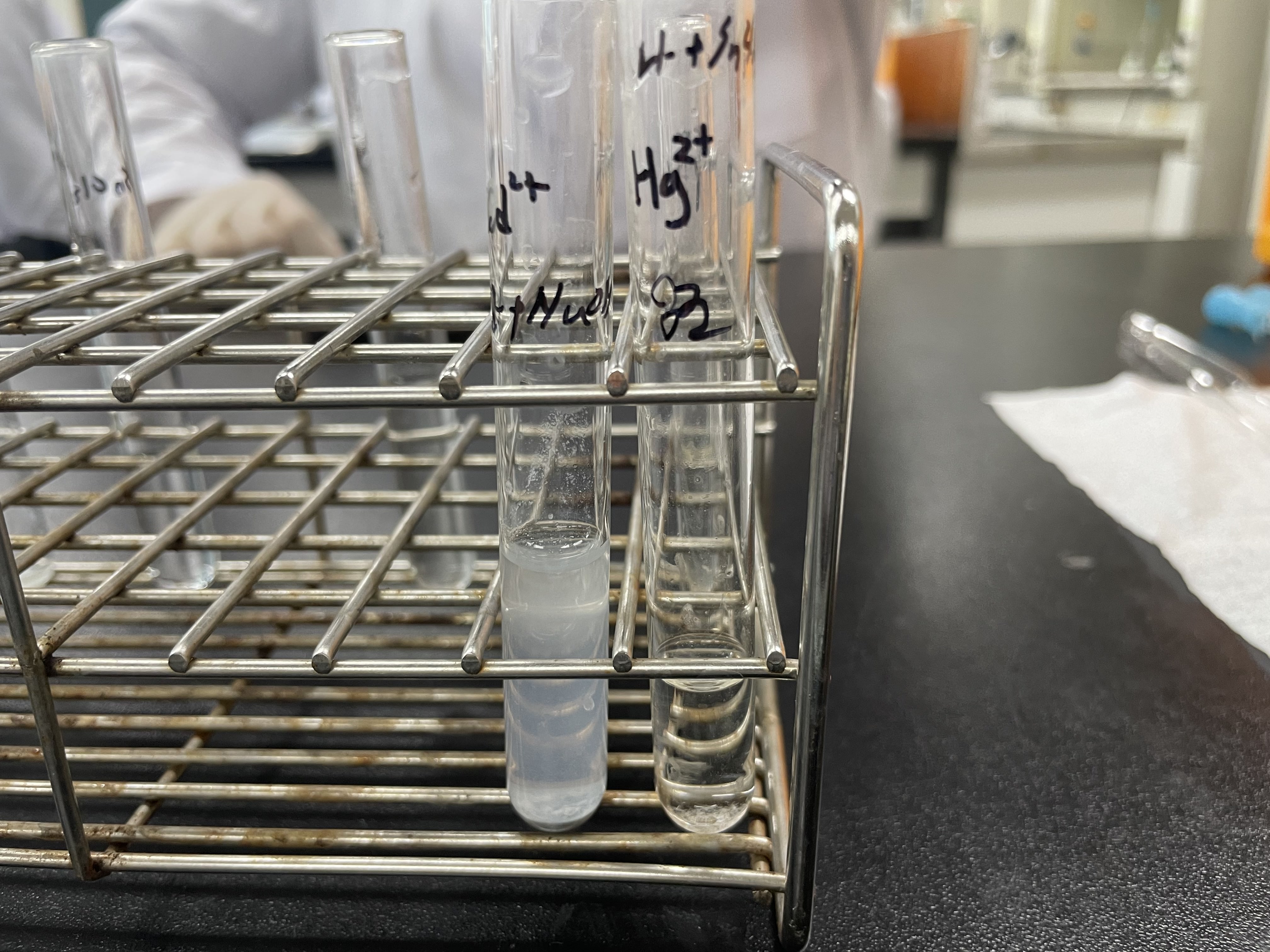 5 2번 과정에서 얻은 상층액에 0.5M SnCl2용액을 1ml 가한 후 원심분리하고 상층액과 침전을 분리한다. 6 5번 과정에서 얻은 상층액에 6M NaOH를 1ml 가한 후 침전을 확인한다.