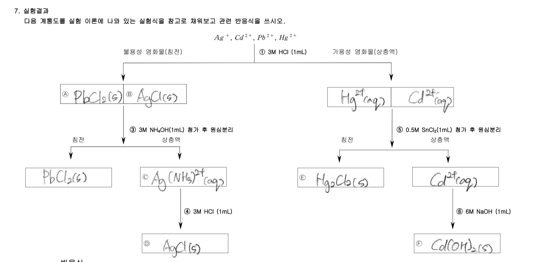 8 미지시료 A와 B에 대해서 1~7 과정으로 실험하여 어떤 양이온이 들어있는지 알아본다.