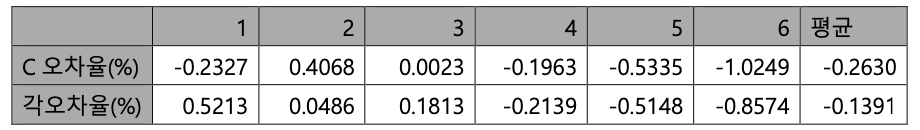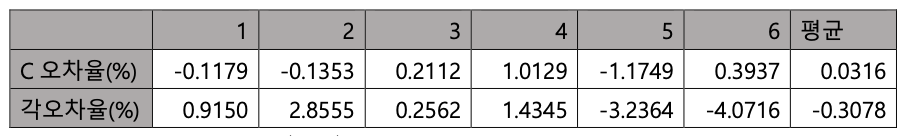 C오차율 표준편차 0.726%, 평균 0.0316%. 각오차율 표준편차 2.742% 평균 -0.3078%로 이전실험들에 비해 각오차율의 편차치가 증가하였다. 해당 실험에서 각오차율의 크기가 2,3회차를 제외하고 모두 증가하는 경향성을 보인다.
