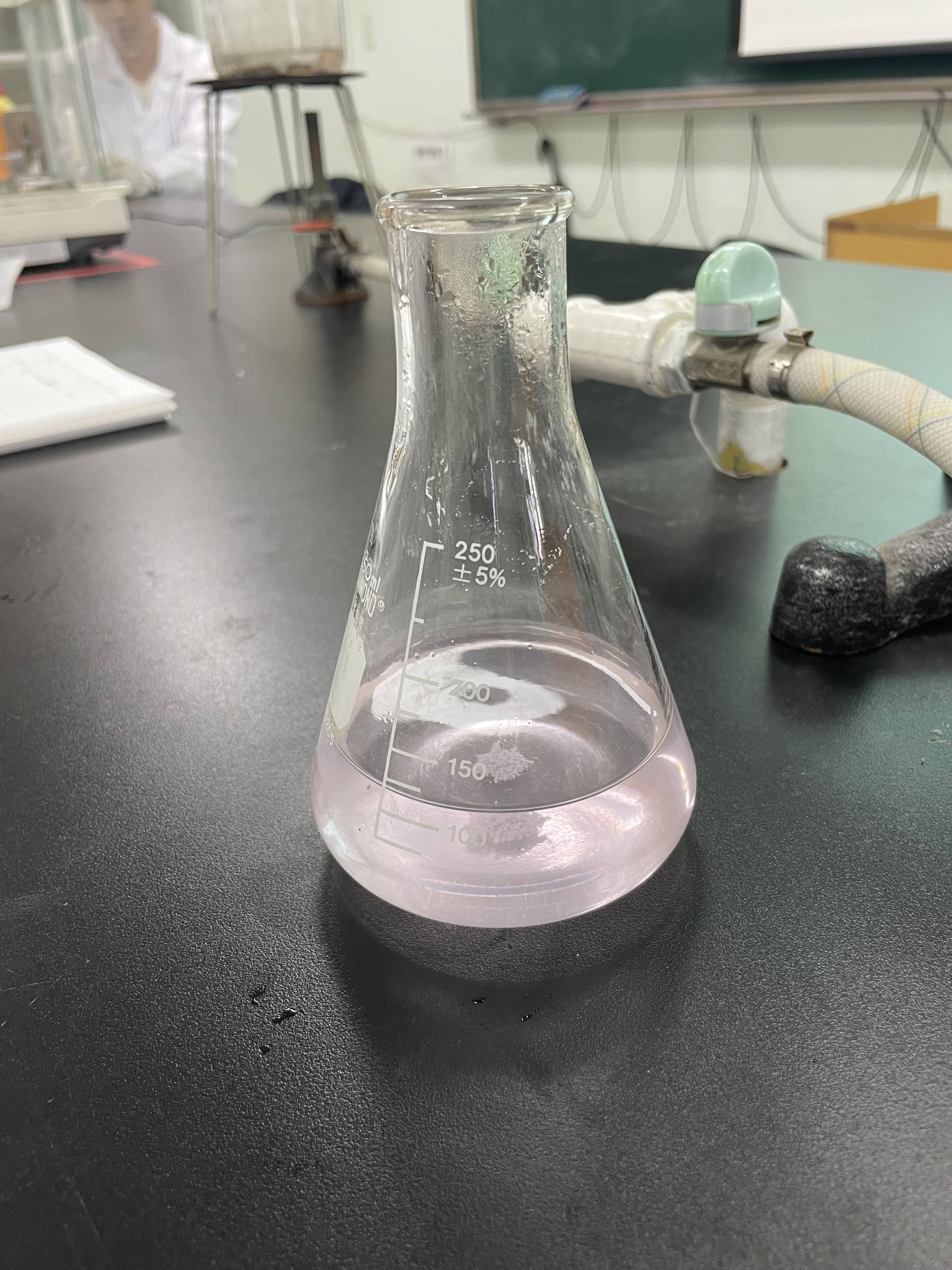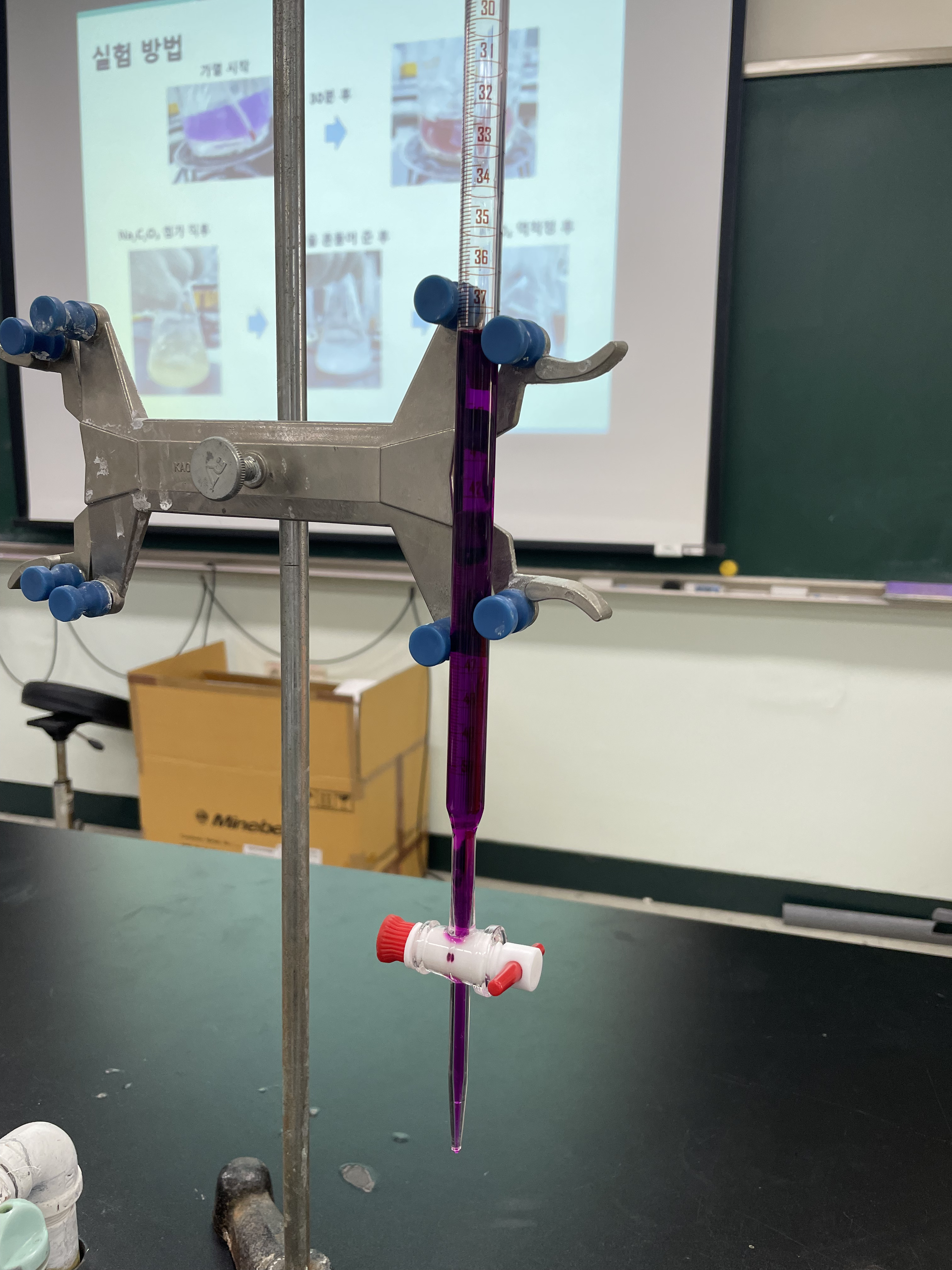 ⑨ 0.025N KMnO4 용액으로 뷰렛을 씻어준 후, ⑧번의 투명해진 용액이 옅은 분홍색을 나타낼 때까지 0.025N KMnO4 용액을 천천히 넣어 적정한다. (적정 시 플라스크를 흔들어주어 색이 완전히 변하였는지 확인하여야 한다.)