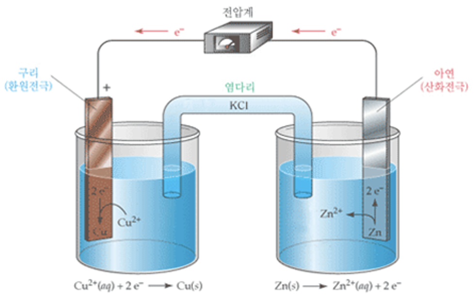 전체 산화·환원 반응 과정에서 전자들은 외부 도선을 통하여 산화전극으로부터 환원전극으로 흐른다. 용액 속에서 음이온이 산화전극으로 이동하는 동안 양이온은 환원전극으로 이동한다. 그러나 두 용액 사이에 염다리를 연결하지 않으면, 산화전극 부근에서는 Zn2+이온의 생성으로 양전하가 쌓이고 환원전극 부근에서는 Cu2+이온이 Cu로 환원돼서 음전하가 쌓여 전지의 작동이 정지될 수 있다.