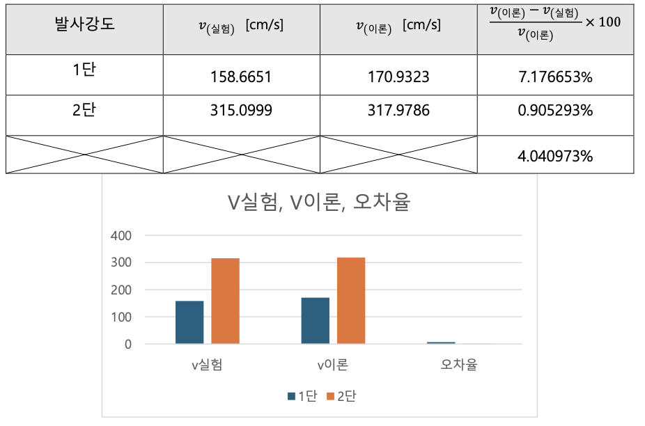 우리 실험은 표준편차 / 평균값의 백분율이 3%이하 일정도로 정밀하게 신뢰도가 높은 실험을 수행하였다. 또한 1 단에서는 7.176653%, 2 단에서는 0.905293%정도의 오차율을 보였다. 1 단일때보다 2 단일때가 탄환 발사속도의 오차율이 더 작아졌지만, 발사각𝜃와, 발사거리𝑥)의 값자체와 값들의 표준편차는 1 단에서는 0.126861°에서 0.751015° 2 단에서는 0.969214° 에서 1.107644°로 커졌다. 발사 단수가 커질 수록 탄환의 속도가 빨라지고 값들의 표준편차가 커지는 것을 확인 할 수 있었다.