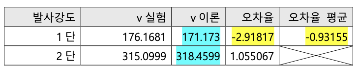 (1) 1단과 실험시 7.17665% 로 2단에 비해 큰 양수의 오차율을 보였다. 그러므로 1단실험 상대적으로 크게 발사힘의 에너지 전환 과정에서 손실이 일어났다고 생 각할 수 있다. 1단에서 측정시 발사각이 10% 덜 측정했다고 가정하면 발사각값들 은 다음과 같다.