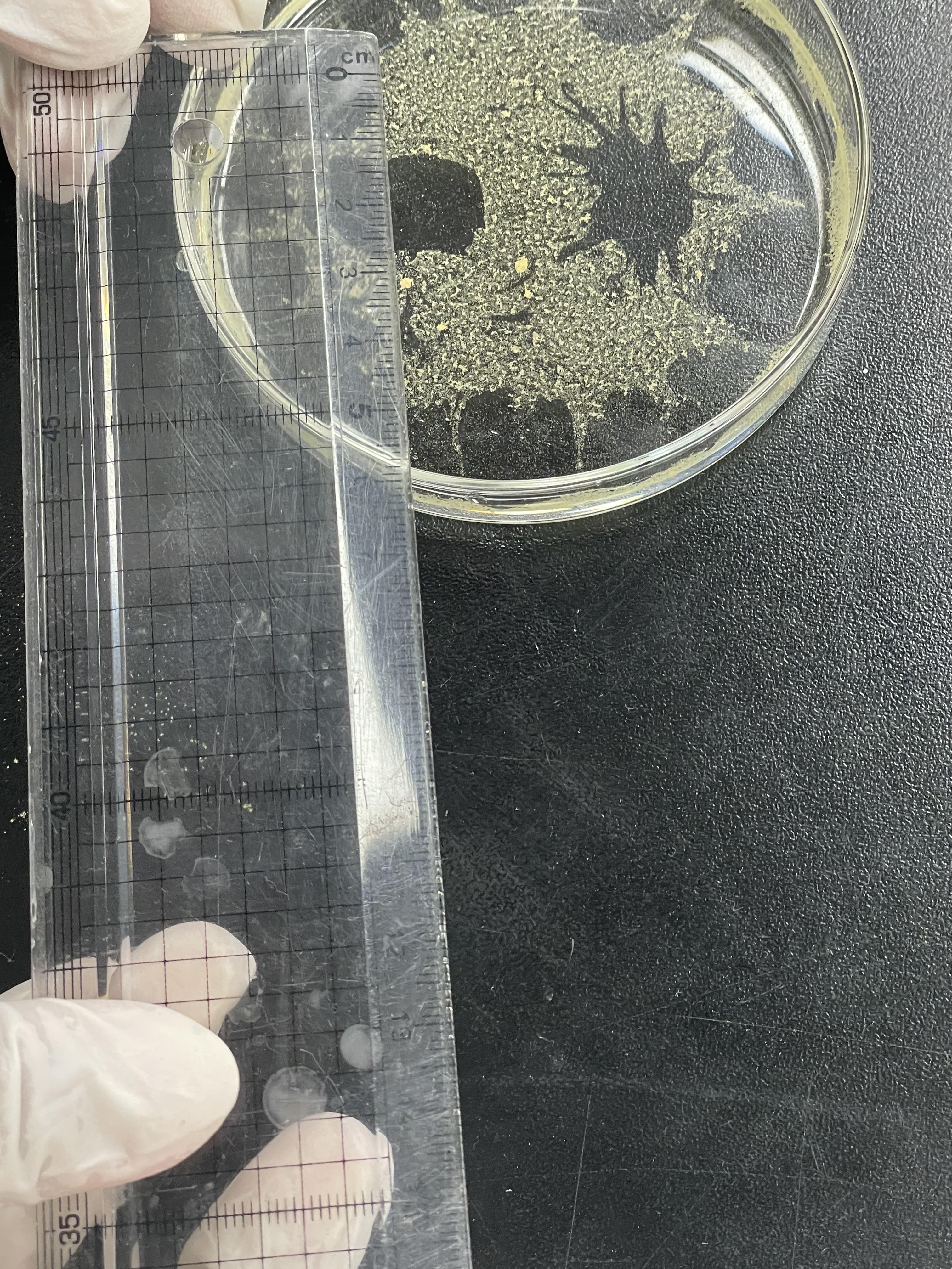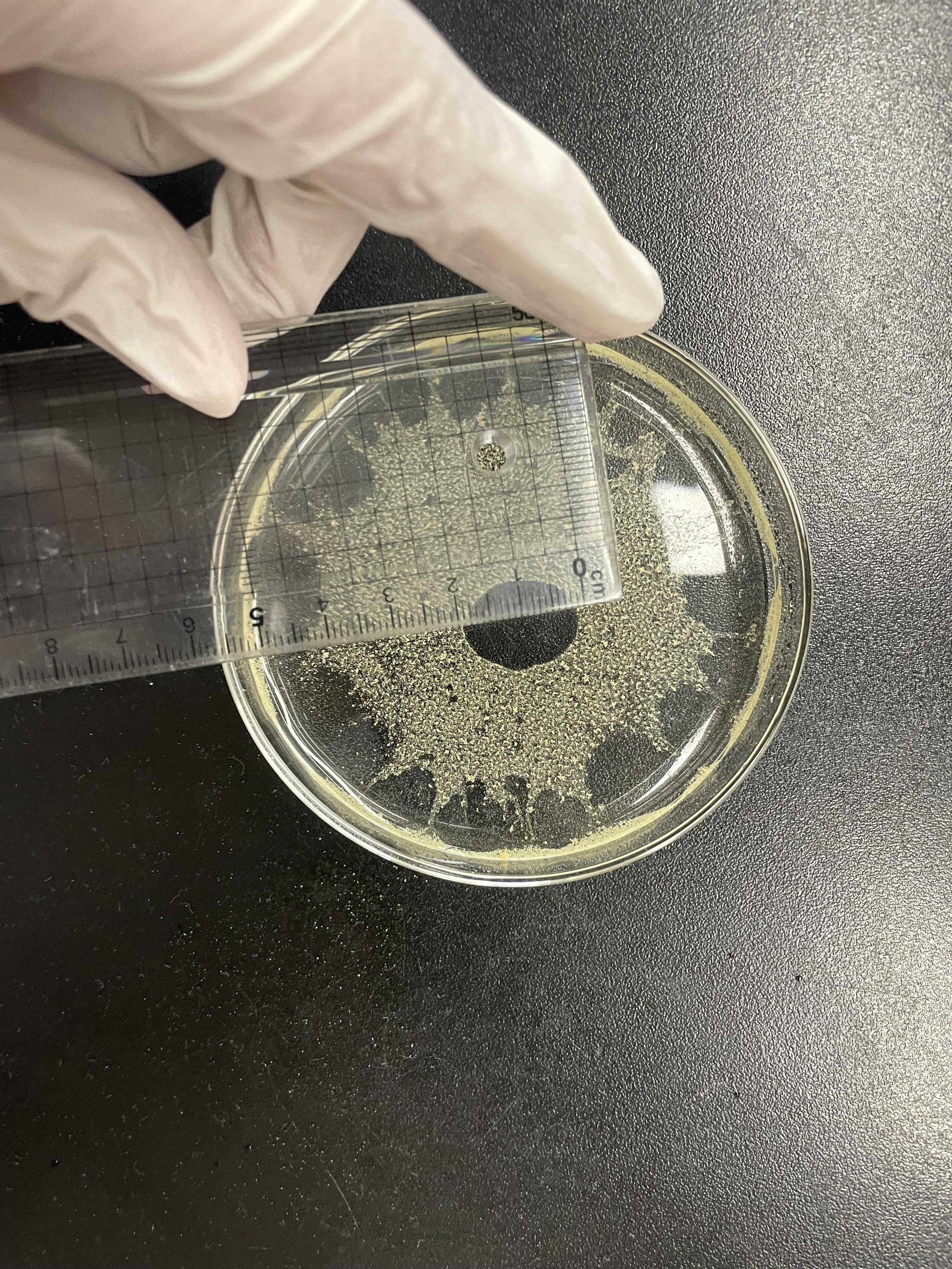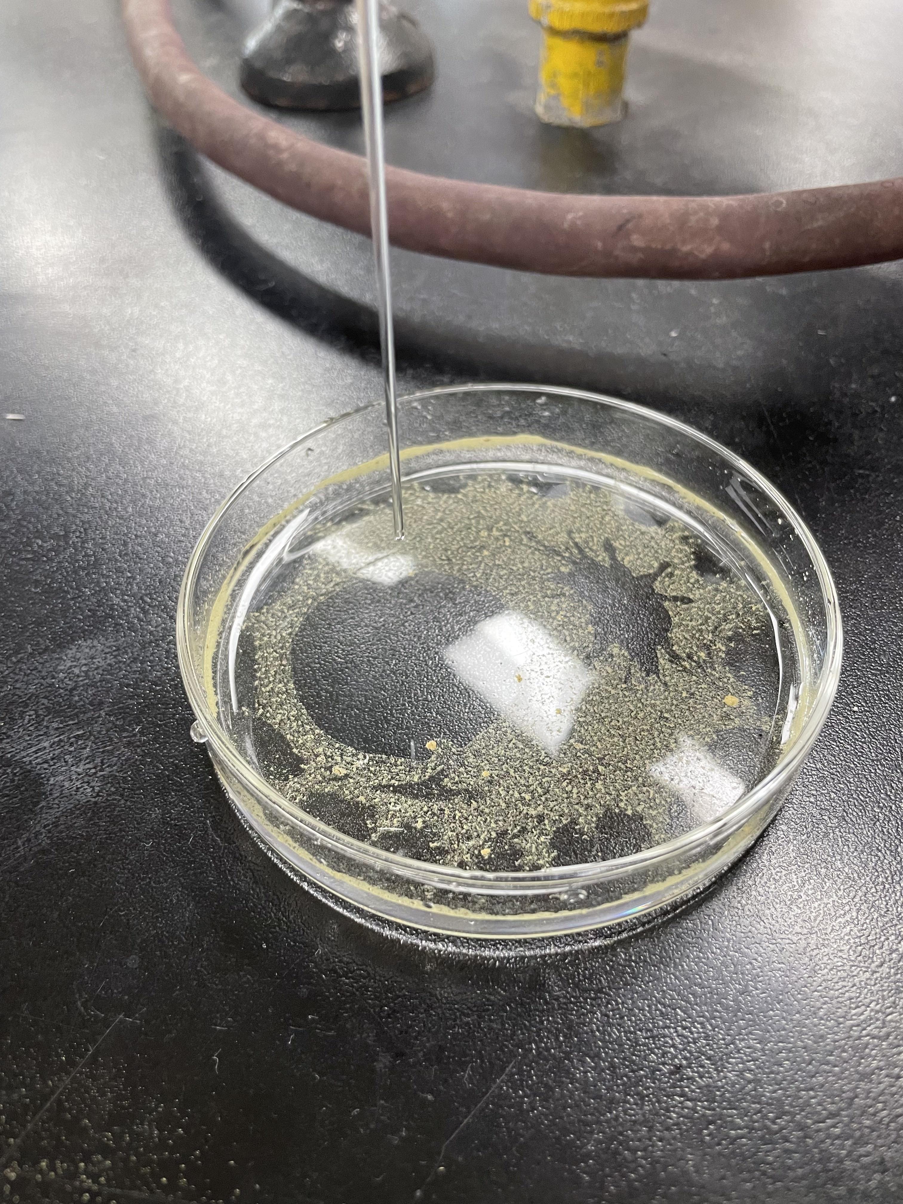 - 시약 스푼을 이용하여 송화 가루를 페트리 접시 중심에 소량 뿌려준다.