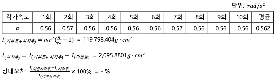 로 계산 할 수 있다. 이를 활용해 관성모멘트와 오차율을 다시 계산해보면