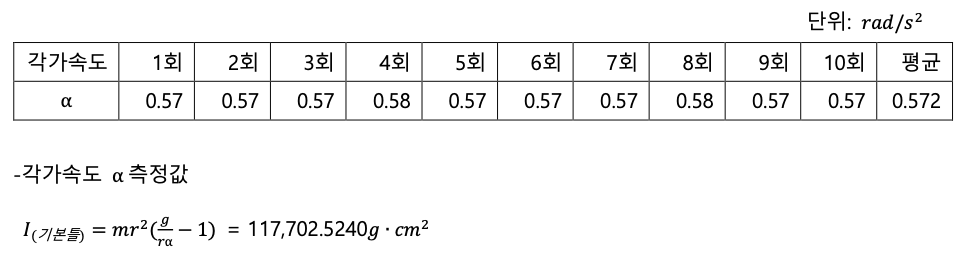실험 1, 실험 2-1, 2, 3, 4, 5, 실험 3-1, 2에서 각가속도 측정시 표준편차가 0.004, 0.004, 0.00447, 0.00632, 0.00663, 0.003, 0.00748, 0.004 (단위: 𝑟𝑎𝑑/𝑠!)로 상당히 작게 측정되어 신뢰성이 높게 측정되었다고 할 수 있다. 이후의 모든 계산과정에 각가속도를 활용하기 때문에 실험자체의 신뢰성이 높다고 판단 할 수 있다.