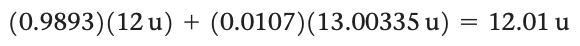 (0.9893)(12 amu) + (0.0107)(13.00335 amu) = 12.01amu